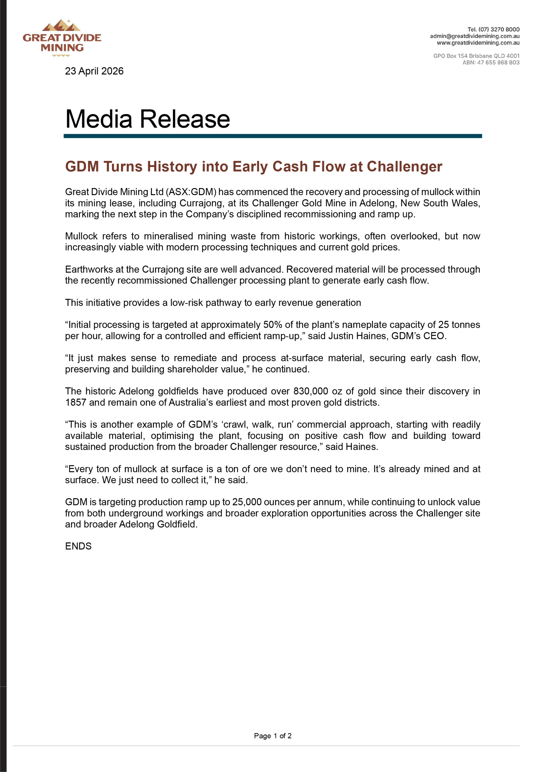 PAC Partners was proud to act as Lead Manager to an oversubscribed $2.5 million Placement for Great Divide Mining Ltd (ASX:GDM), supporting the continued ramp-up and development of the now 100%-own...