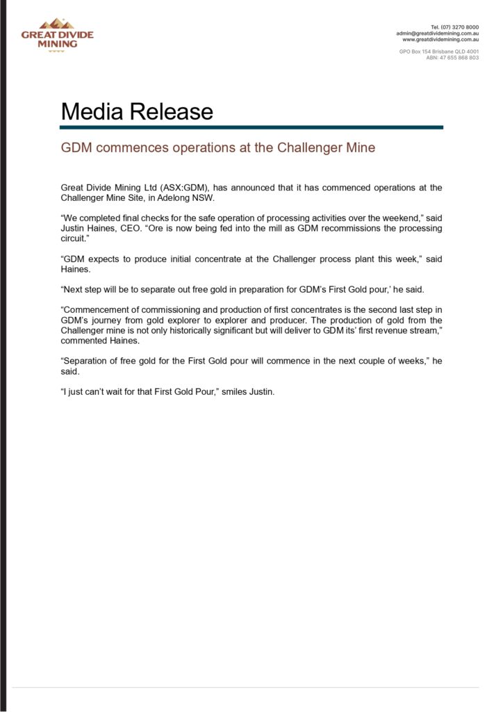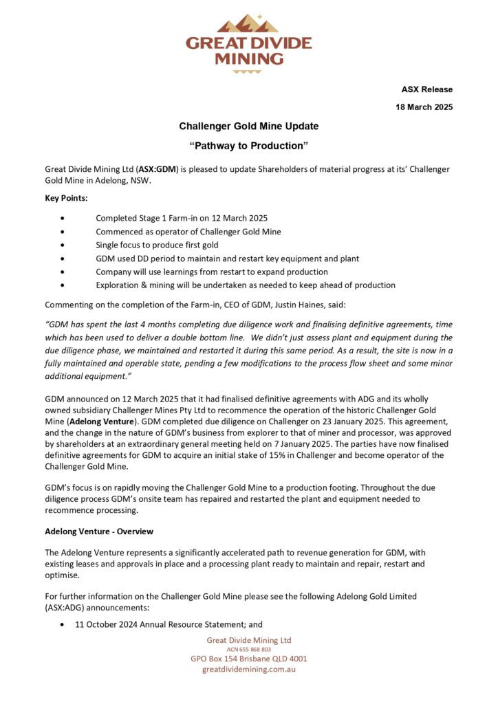 Great Divide Mining Ltd (ASX:GDM) is pleased to update Shareholders of material progress at its’ Challenger Gold Mine in Adelong, NSW. Key Points: Completed Stage 1 Farm-in on 12 March 2025 Commenced as operator of Challenger Gold Mine Single focus to produce first gold GDM used DD period to maintain and restart key equipment and […]