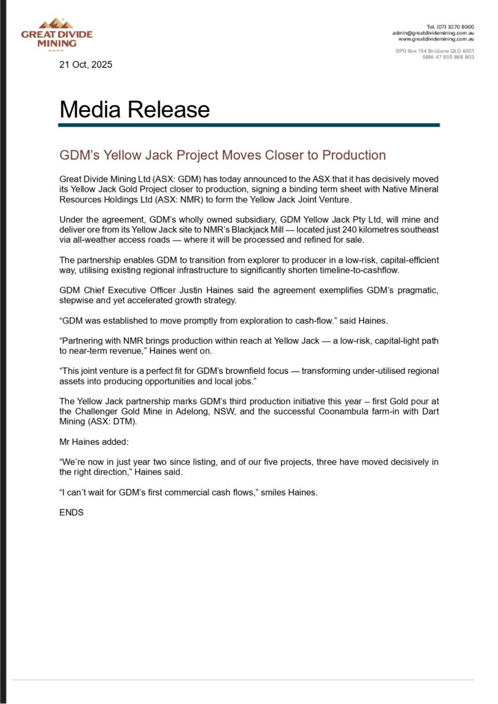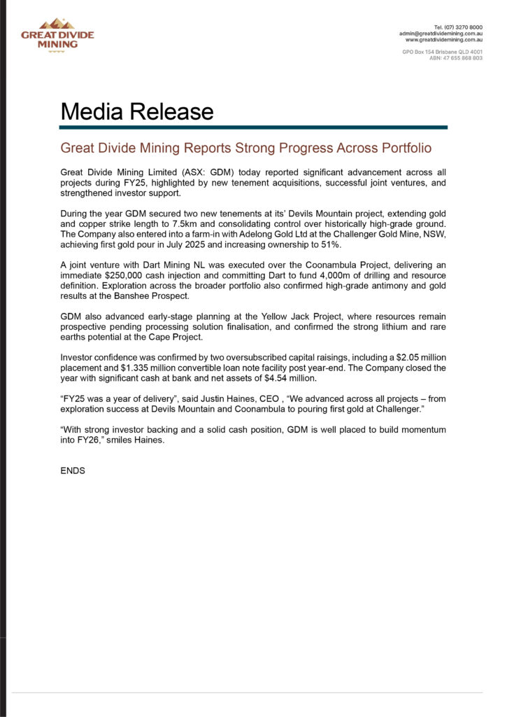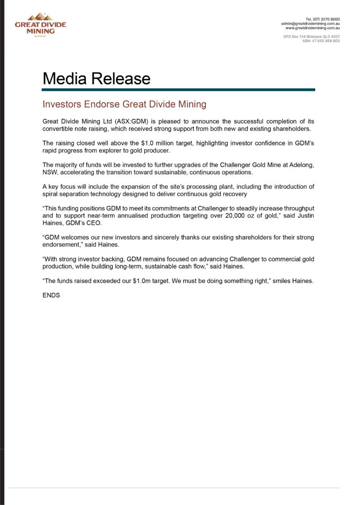 Great Divide Mining Ltd (ASX:GDM) is pleased to announce the successful completion of its convertible note raising, which received strong support from both new and existing shareholders. The raising closed well above the $1.0 million target, highlighting investor confidence in GDM’s rapid progress from explorer to gold producer. The majority of funds will be invested […]