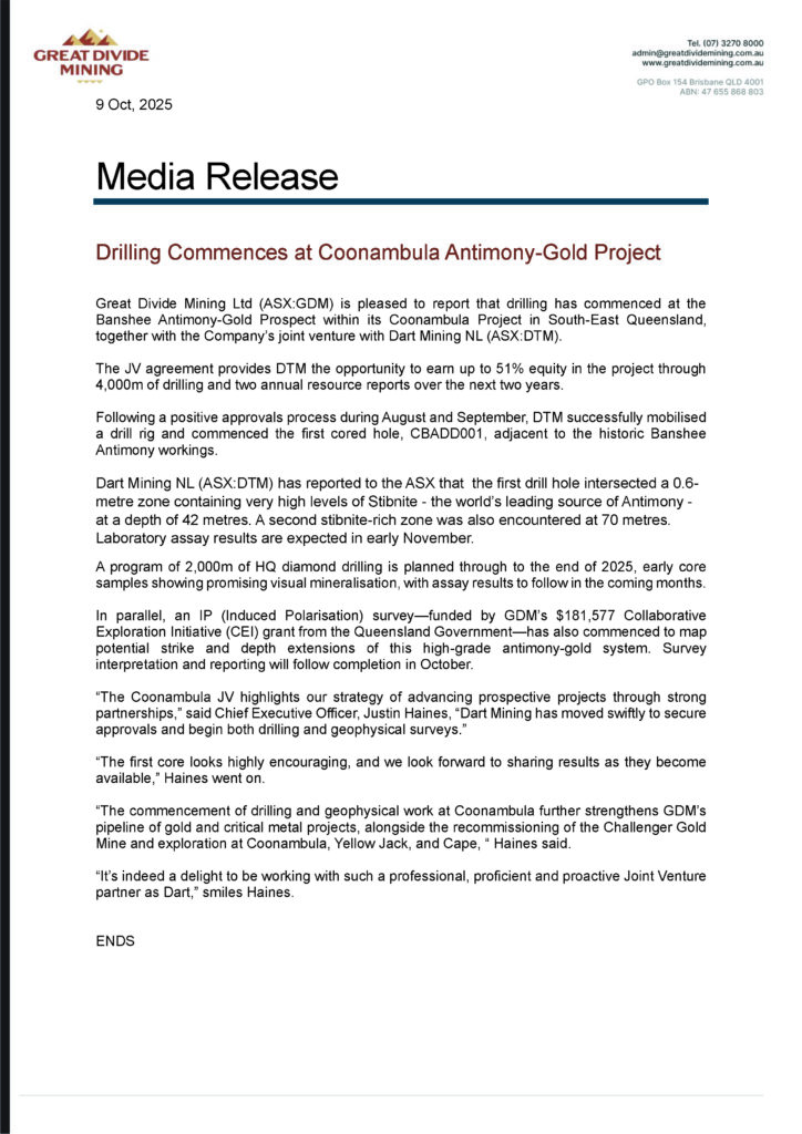 Great Divide Mining Ltd (ASX:GDM) is pleased to report that drilling has commenced at the Banshee Antimony-Gold Prospect within its Coonambula Project in South-East Queensland, together with the Company’s joint venture with Dart Mining NL (ASX:DTM). The JV agreement provides DTM the opportunity to earn up to 51% equity in the project through 4,000m of […]