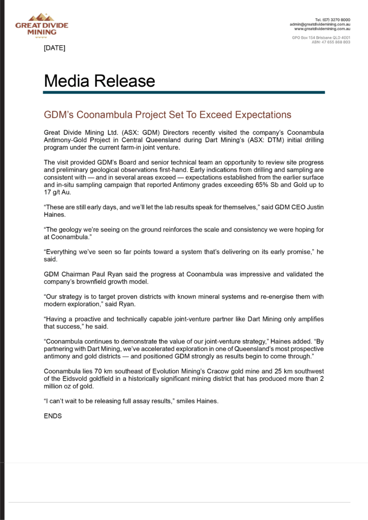 Great Divide Mining Ltd. (ASX: GDM) Directors recently visited the company’s Coonambula Antimony-Gold Project in Central Queensland during Dart Mining’s (ASX: DTM) initial drilling program under the current farm-in joint venture. The visit provided GDM’s Board and senior technical team an opportunity to review site progress and preliminary geological observations first-hand. Early indications from drilling […]