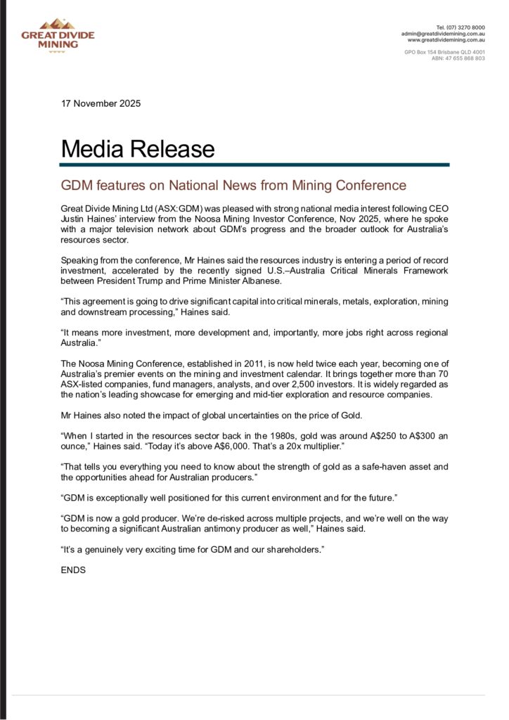 Great Divide Mining Ltd (ASX:GDM) was pleased with strong national media interest following CEO Justin Haines’ interview from the Noosa Mining Investor Conference, Nov 2025, where he spoke with a major television network about GDM’s progress and the broader outlook for Australia’s resources sector. Speaking from the conference, Mr Haines said the resources industry is […]