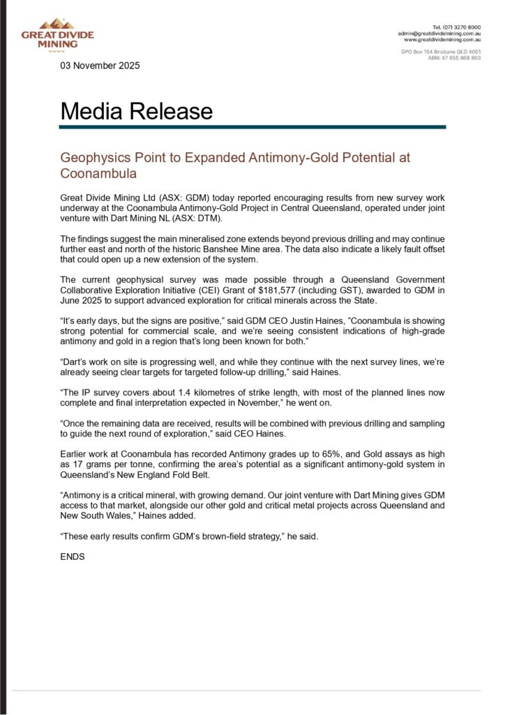 Great Divide Mining Ltd (ASX: GDM) today reported encouraging results from new survey work underway at the Coonambula Antimony-Gold Project in Central Queensland, operated under joint venture with Dart Mining NL (ASX: DTM). The findings suggest the main mineralised zone extends beyond previous drilling and may continue further east and north of the historic Banshee […]